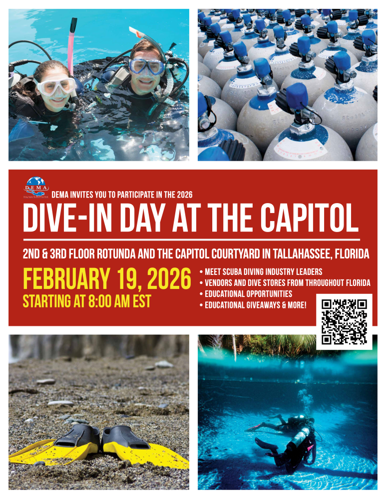 San Diego, CA (Janaury 13, 2026) – Each year, DEMA sponsors “Dive in Day” at the Capitol in Tallahassee, Florida, giving DEMA Members the opportunity to visit our state’s Capitol, showcase their diving-related products and services, and promote issues relating to the scuba diving industry. We are excited to announce that this year’s Dive in Day at the Capitol will take place on February 19, 2026.